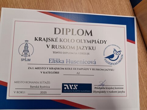 Eliška Husenicová z 9.A a Michal Majchút z 8.A dňa 4. 2. 2025 úspešne reprezentovali našu školu v Krajskom kole olympiády z ruského jazyka v Banskej Bystrici.